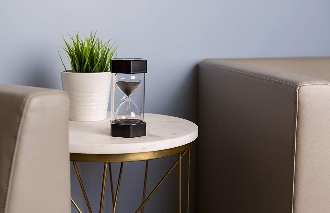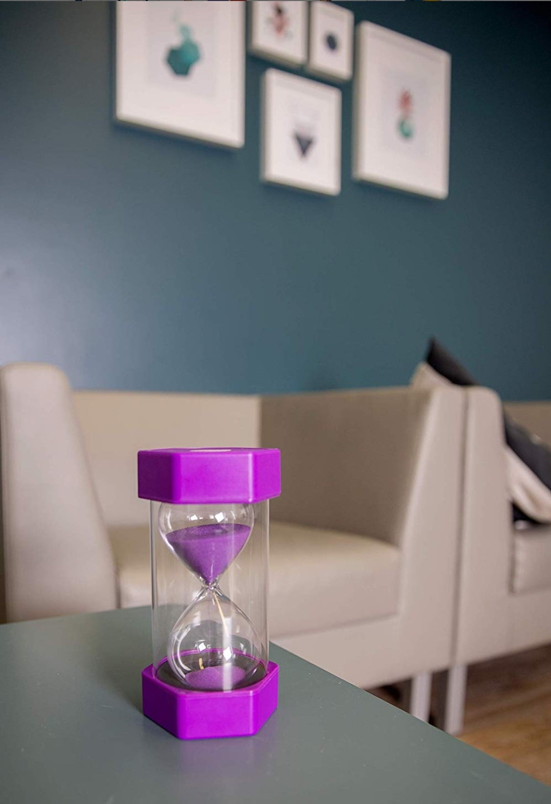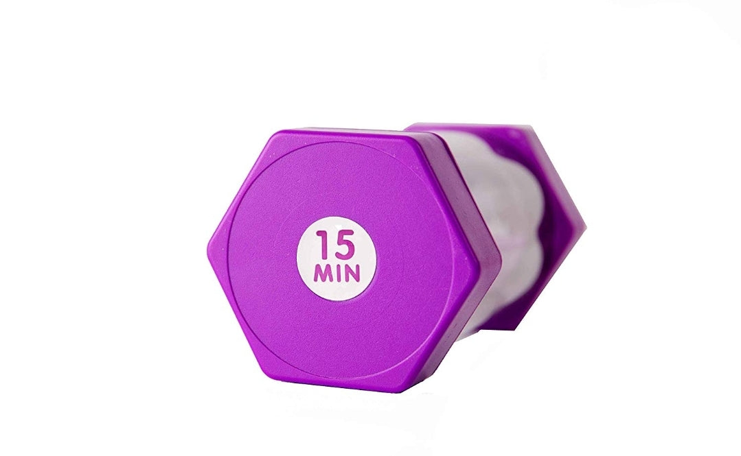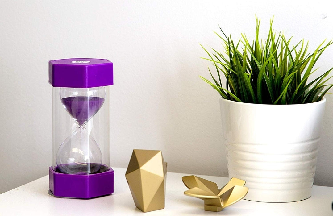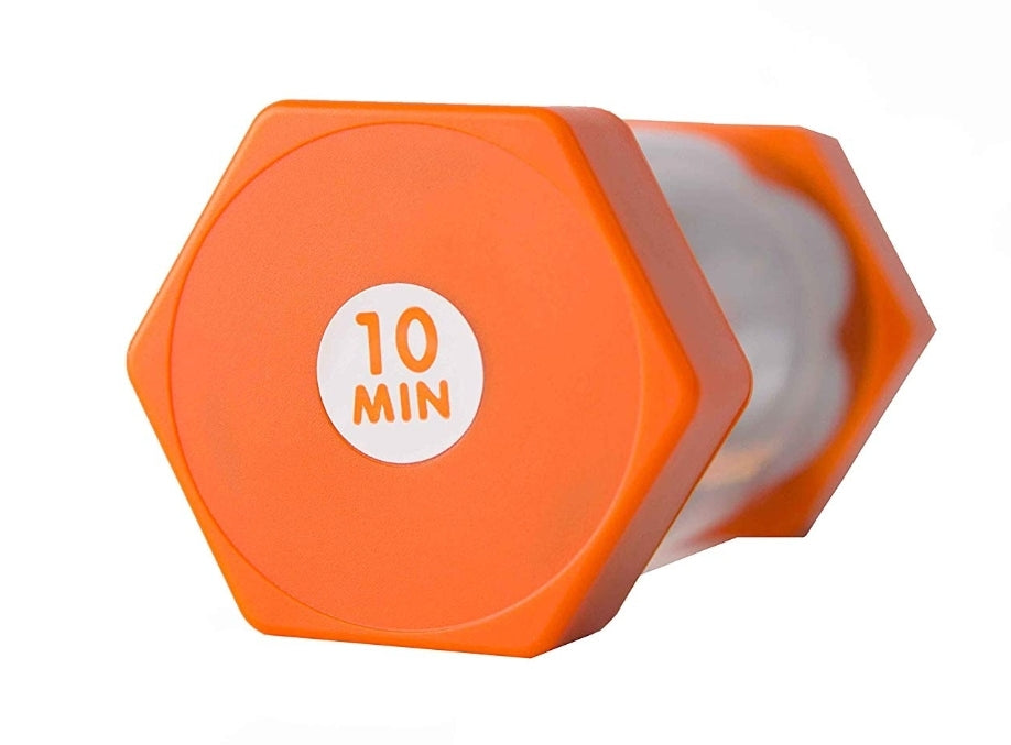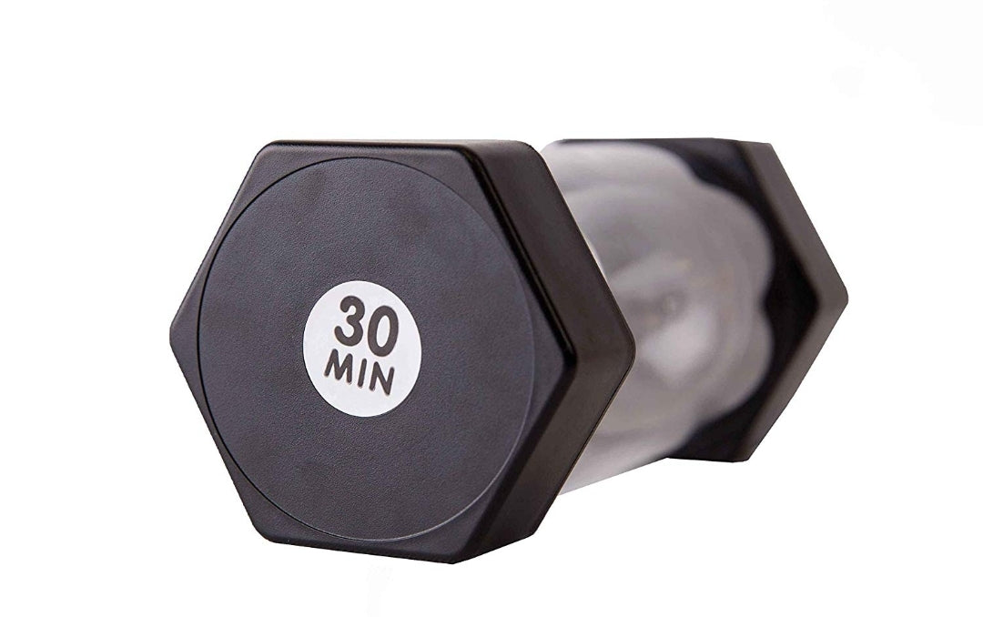Sand timer with moulded end caps and shatterproof plastic barrier to protect the inner glass.