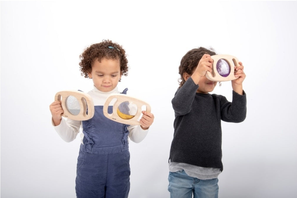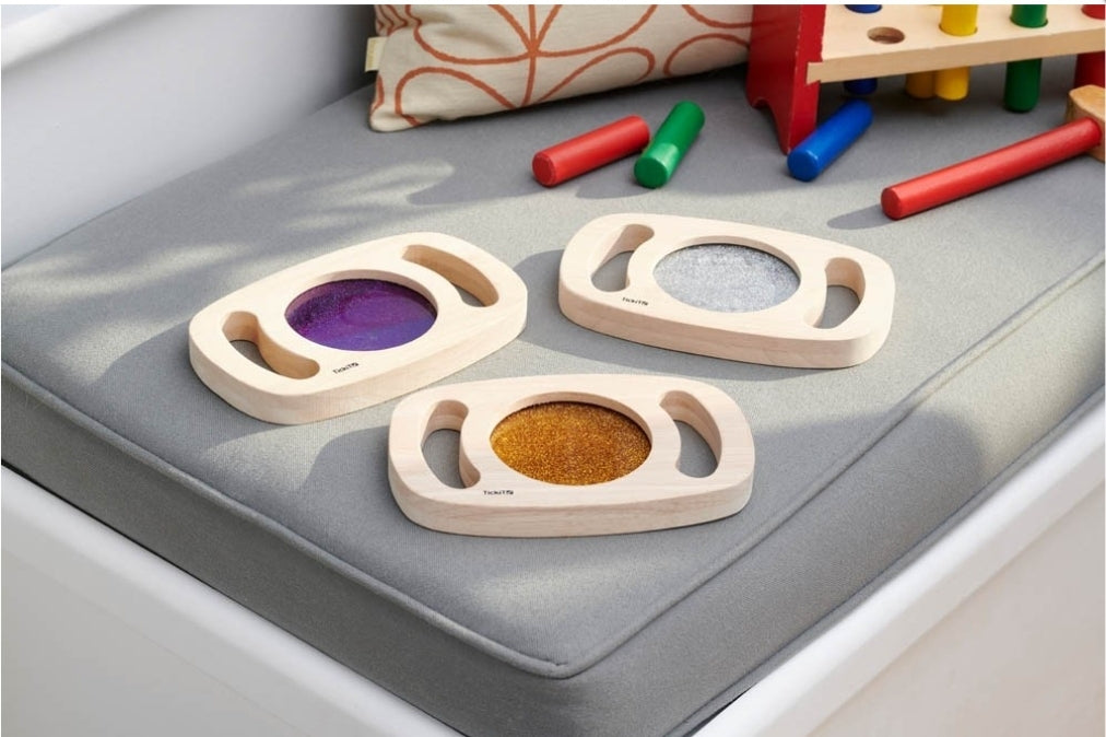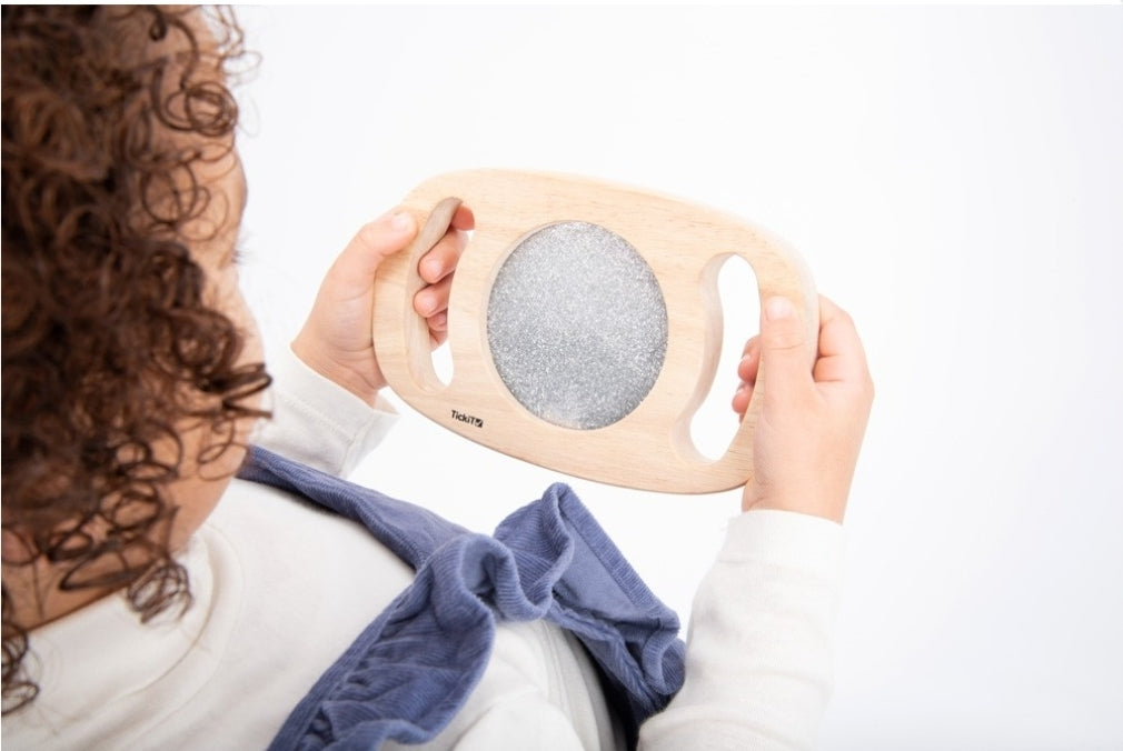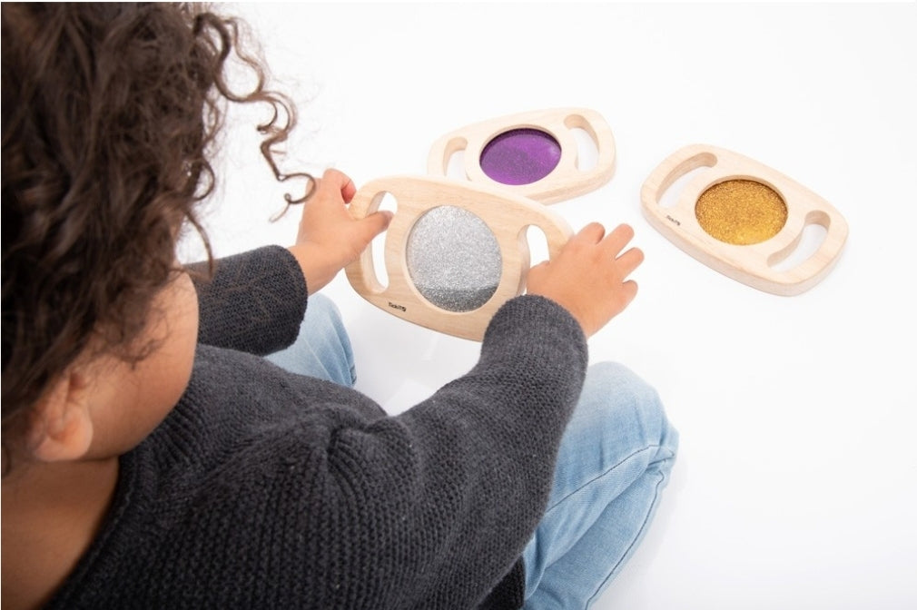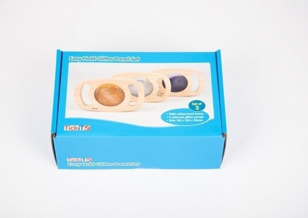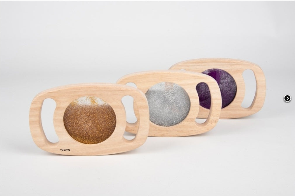 Solid rubberwood frames with easy hold handles enclosing a panel of sparkling glitter, one in each colour - purple, silver and gold. The panels can be twisted and turned to make the glitter liquid move and flow in fascinating ways. Ideal for sensory discovery and broadening descriptive vocabulary.
