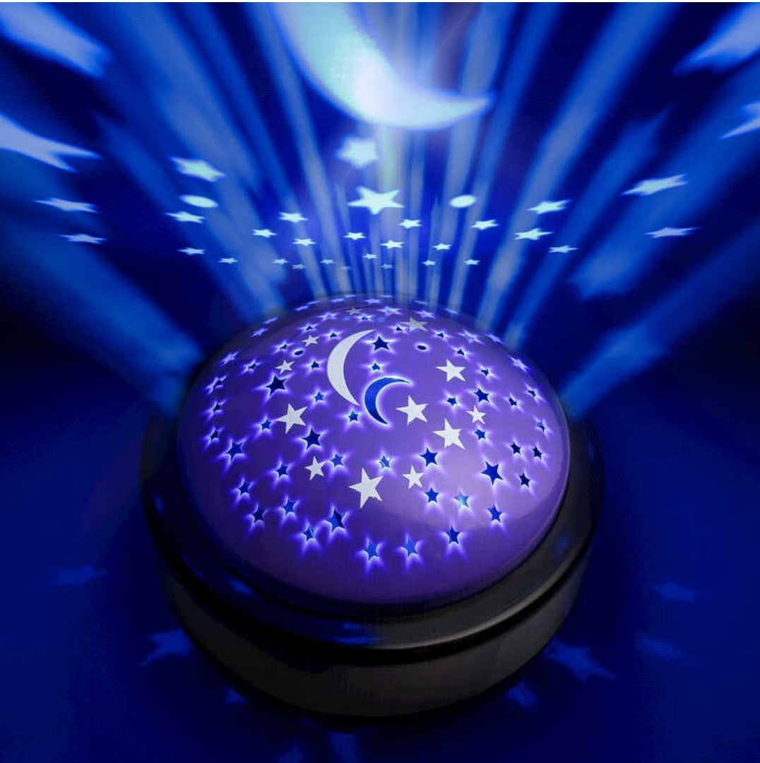Small projector unit that projects a starry sky across the ceiling. The top of the unit is covered in specially shaped holes that sit above a light, allowing it to shine through the gaps and make stars and a crescent moon appear on the surface immediately above the projector. The device itself is purple with a starry design on the top that closely resembles the projected light patterns.
